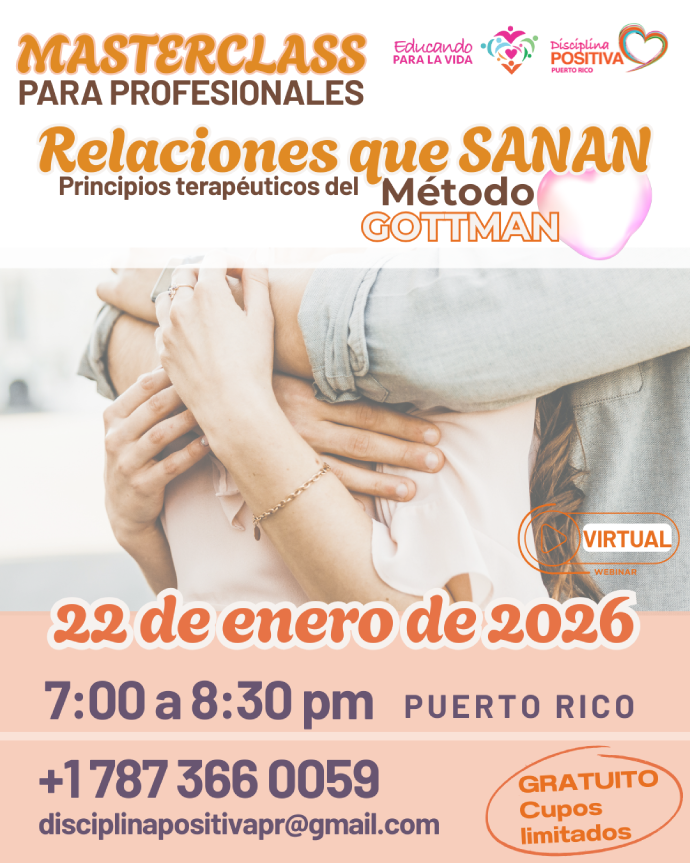 MasterClass Relaciones que Sanan Dictante Marcia J. Gomez LCSW Lugar San Juan, Puerto Rico Fecha 22 de enero, 2026 Organiza Disciplina Positiva Puerto Rico Registro -- Más info +1787-366-0059 [email protected] 22 de Enero 2026.